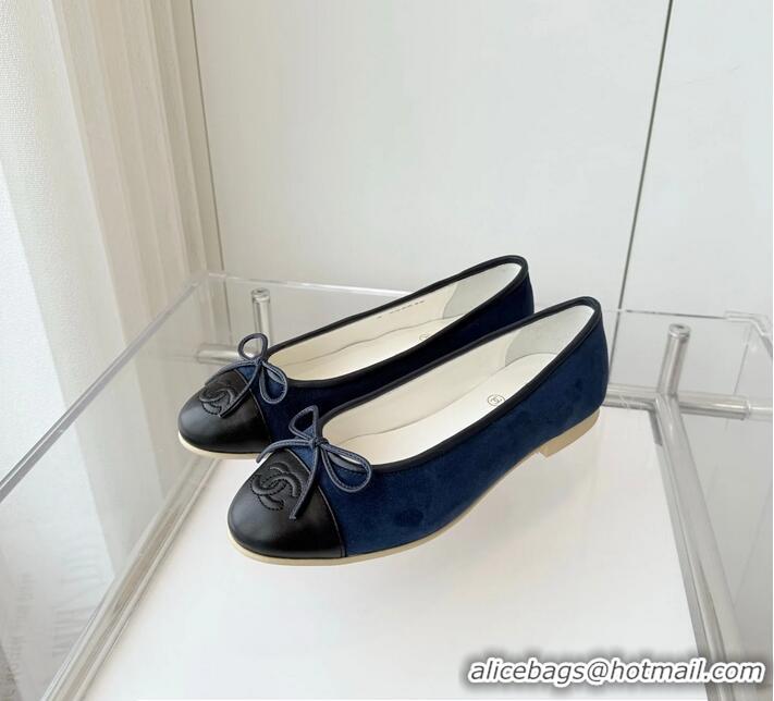 Grade Discount Chanel CC Ballet Flat With Bow Suede CH1023 Navy Blue/Black
