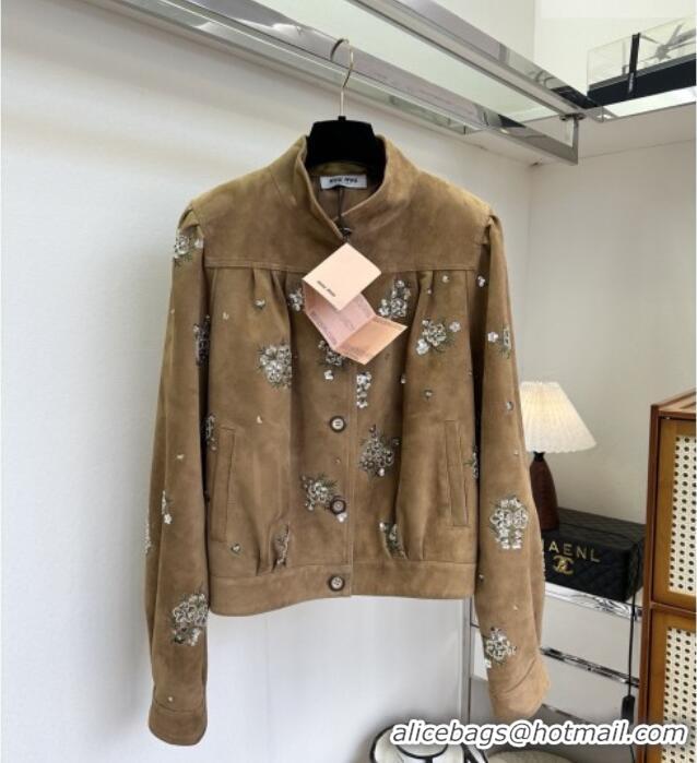 Super Quality Miu Miu Sheepskin Suede Jacket with Strass 0814 Tan Brown 2025