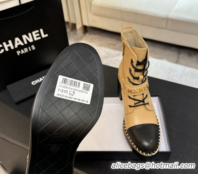 AAAAA Chanel Calfskin Leather Laced-up Ankle Boots with Chain Beige Yellow 2025 CH110405 1104037