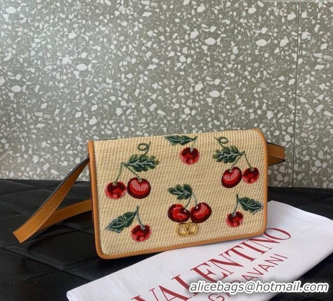 Affordable Price Valentino Vlogo Signature mini shoulder bag in jacquard raffia starw with Cherryfic motif 2089 Beige 20