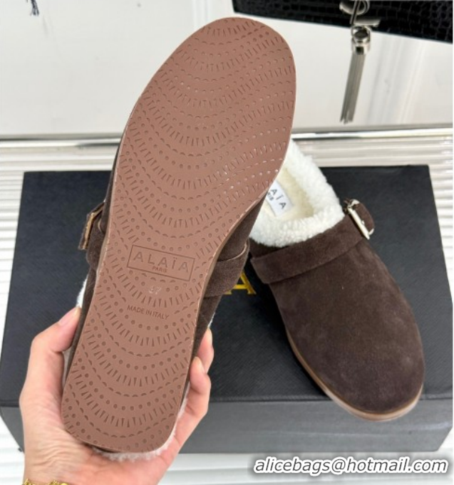 Affordable Price Alaia Suede and Wool Flat Mules with Buckle Dark Brown 2026 AL102912 1029153