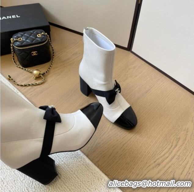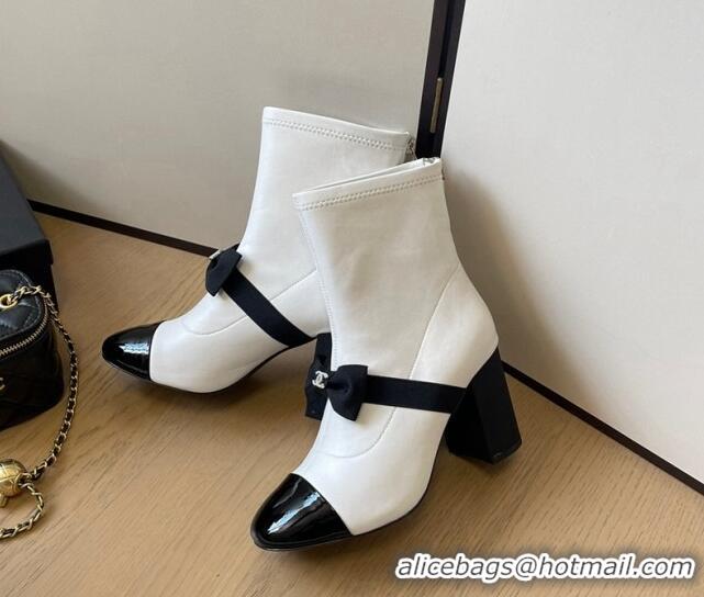 Good Product Chanel Calfskin Heel Ankle Boots 8cm with Bow White 102043