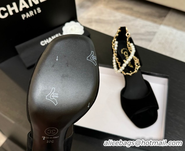 Best Grade Chanel Suede Heel Sandals 8cm with Chain and Pearls Black 2025 G46658