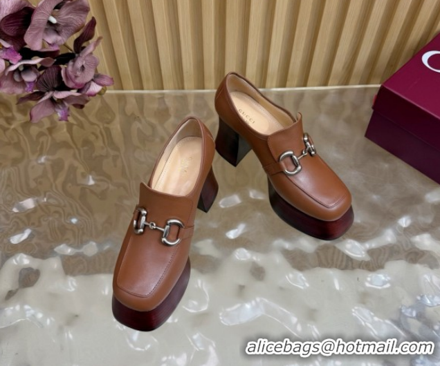 Best Grade Gucci Calf Leather Platform Pumps 9cm with Horsebit GG121804 Brown 2026