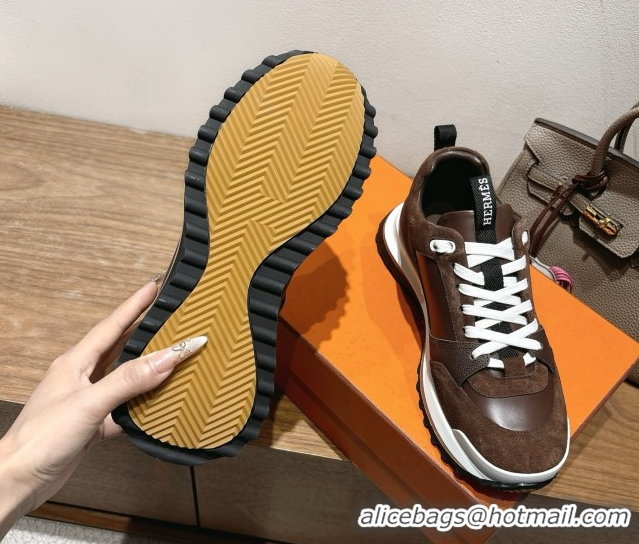 Best Grade Hermes Leader Sneakers in Suede and Calfskin Leather Dark Brown 1023041
