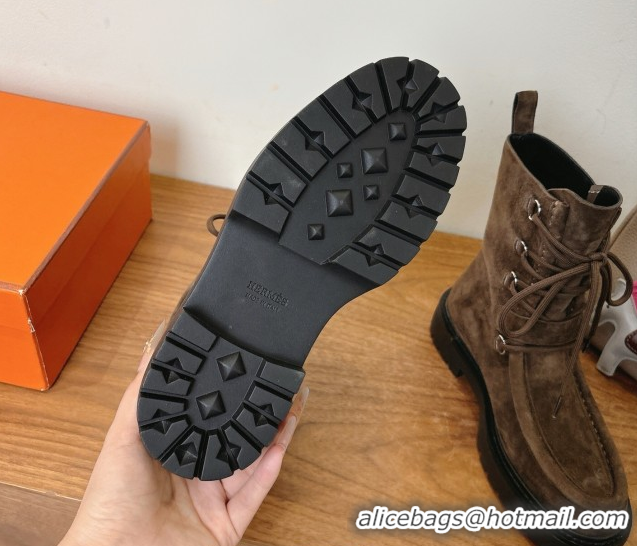 Modern Hermes Land Biker Laced-up Ankle Boots in Suede with Buckle Strap Dark Brown 1023042