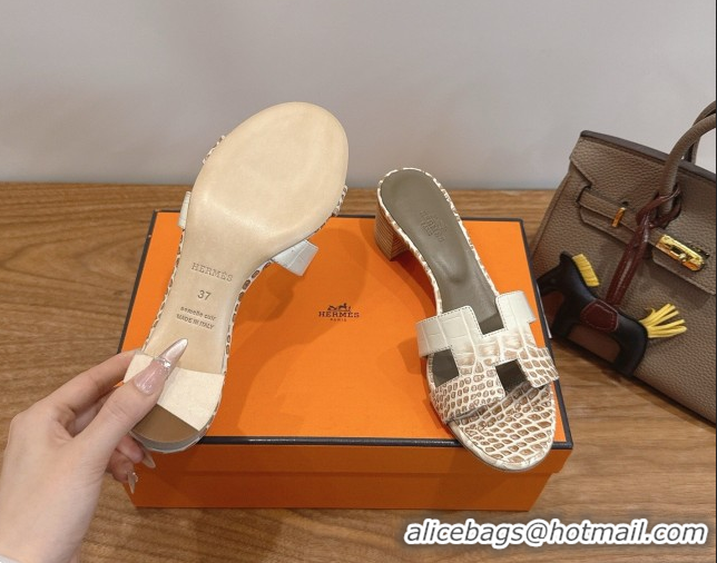 Top Grade Hermes Oasis Classic Heel Slides Sandal 4.5cm in Crocodile Embossed Leather White/Brown 2026 0304031