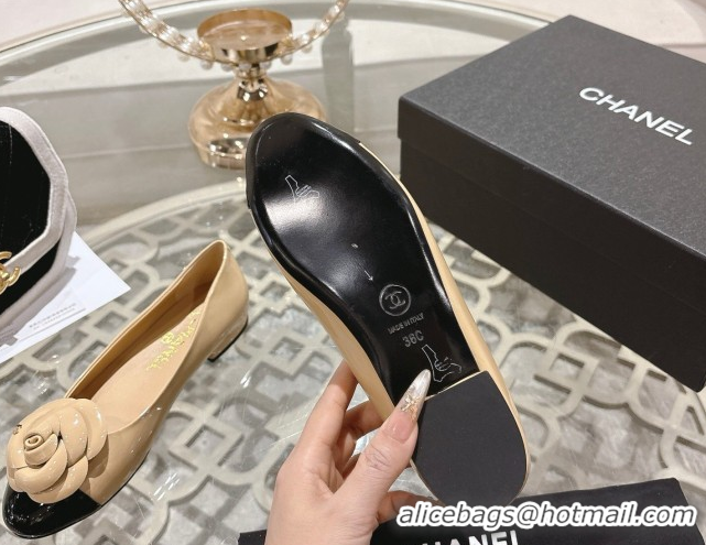 Your Position: Home > Shoes Plaza > Chanel Shoes > Best Grade Chanel Calfskin Patent Leather Pumps 8.5cm with Camellia Bloom CH030704 Beige 2026