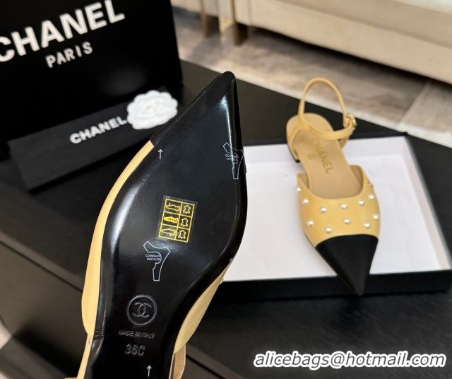 Best Price Chanel Lambskin & Grosgrain Flats Slingbacks with Pearls Beige Yellow 2025 CH110314 1103116