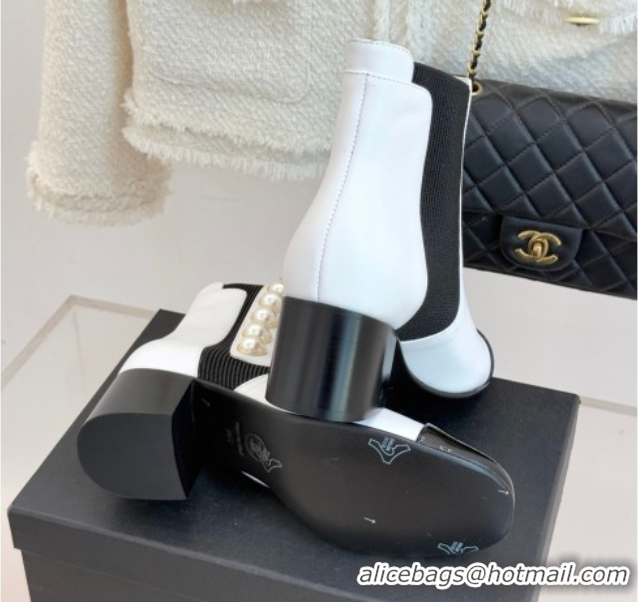 Best Price Chanel Lambskin & Patent Leather Heel Ankle Boots 5cm with Pearls White CH11030316 1103127