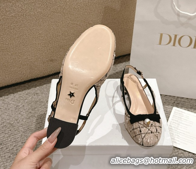 Top Grade Dior Ballet Slingback Pumps 3cm in Cannage Tweed with Pearl Bow Beige/Black 0822023
