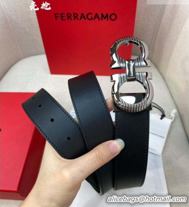 Best Price Ferragamo Belt 3.5cm in Reversible Smooth Leather with Embossed Buckle 0615 Black/Shiny Gunmetal