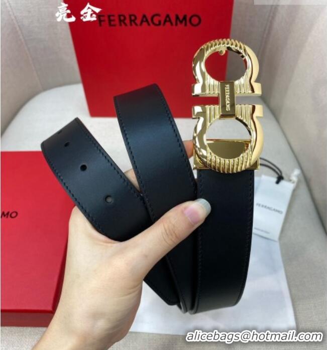 Top Design Ferragamo Belt 3.5cm in Reversible Smooth Leather with Embossed Buckle 0615 Black/Shiny Gold