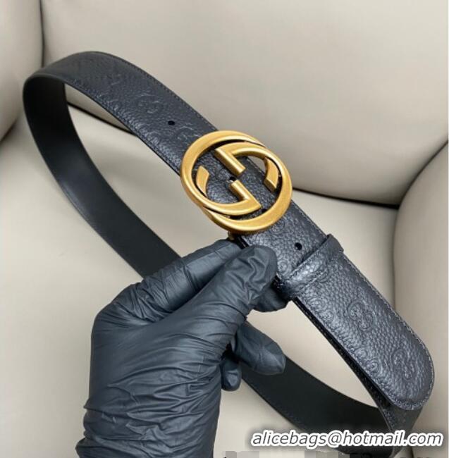 Promotional Gucci GG Embossed Grained Leather Belt 4cm with Interlocking G Buckle GG010902 Black/Aged Gold 2025