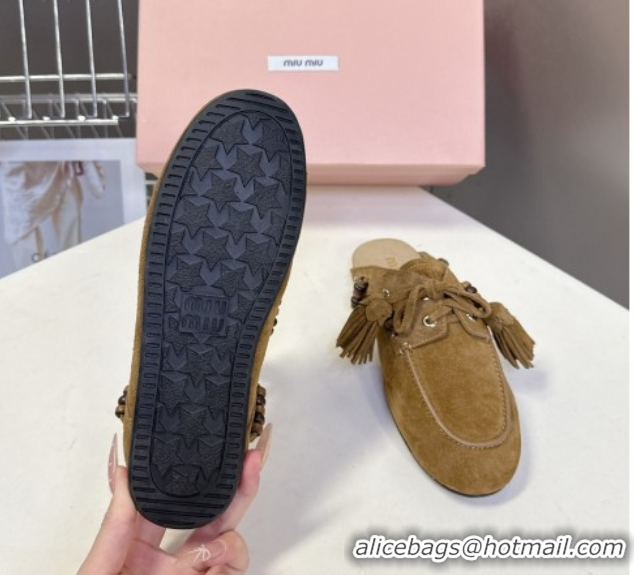 Your Position: Home > Shoes Plaza > Miu Miu Shoes > Best Price Miu Miu Tassel and Beads Mules in Suede Leather Olive Green 5D518E 1025013