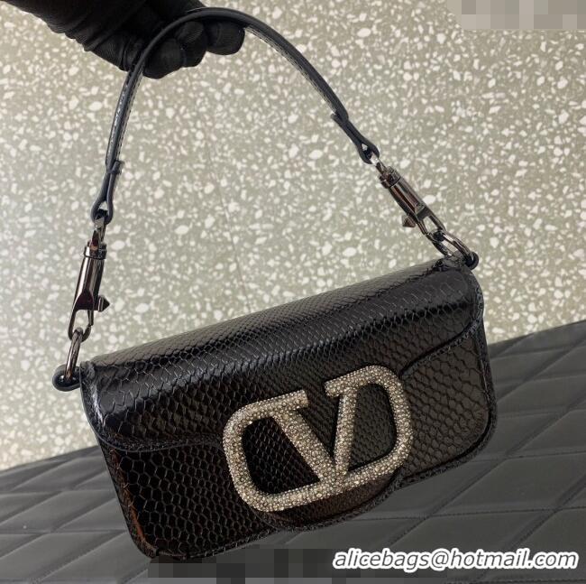 Best Price Valentino Loco Small Shoulder Bag in Snakeskin Embossed Leather with Strass VLTN5030 Black 2024