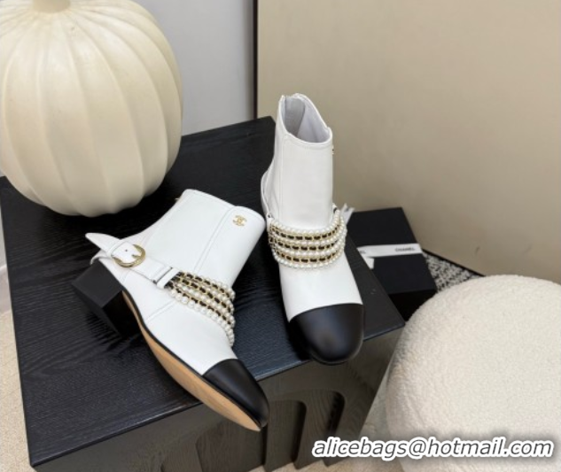 Best Product Chanel Calfskin Leather Ankle Boots with Pearls White 2025 CH110408 1104048