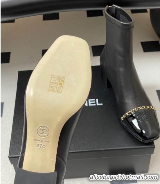 Best Product Chanel Stretch Lambskin and Patent Leather Heel Ankle Boots 5cm with Chain Black 2025 CH110405 1104072
