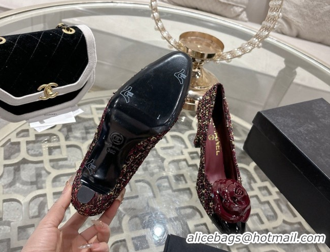 Top Design Chanel Tweed & Patent Leather Pumps 8.5cm with Camellia Bloom CH030704 Burgundy 2026