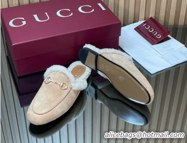 Low Price Gucci Princetown Suede and Wool Flat Slipper with Horsebit Nude 1020028