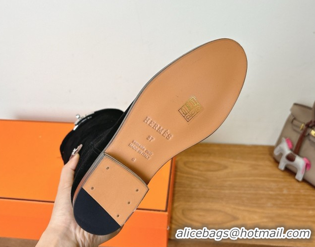 Best Product Hermes Jumping High Flat Boots in Suede with Kelly Buckle Strap Black H102302 1023070