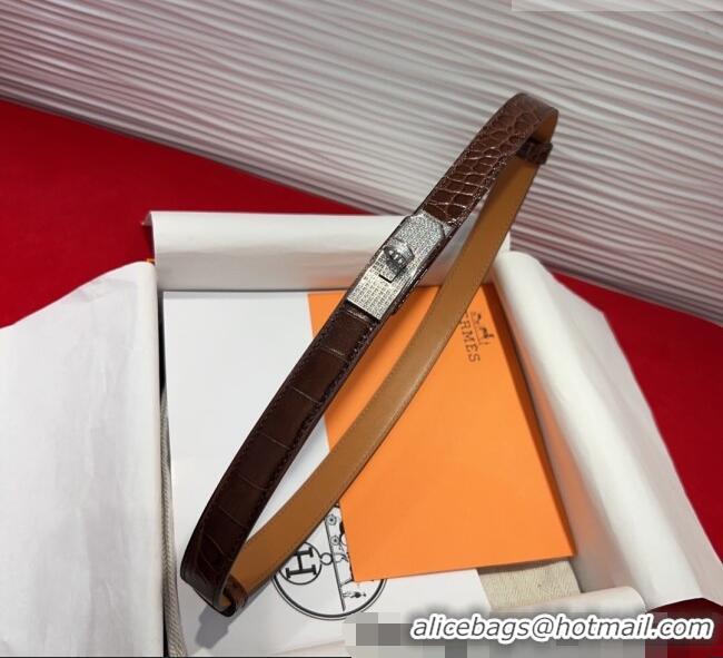 Best Product Hermes Kelly Duo Belt 1.8cm in Crocodile Embossed Calfskin with Silver Strass Paved Buckle H2011025 Dark Br