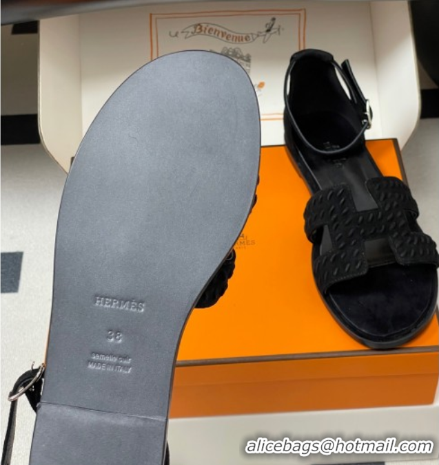 Top Grade Hermes Santorini Flat Sandals in Braided Suede Black 1023083