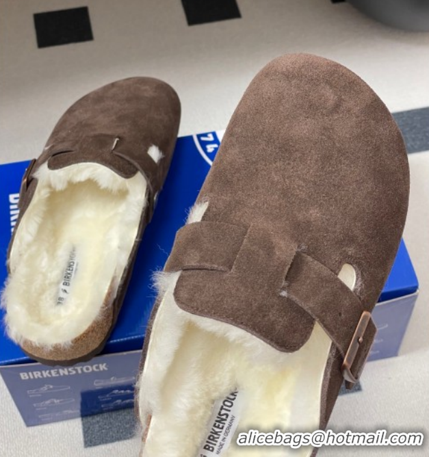 Your Position: Home > Shoes Plaza > Louis Vuitton Shoes > Grade Quality Louis Vuitton x Birkenstock Flat Mules with Buckle Strap in Suede and Wool Dark Brown 1022118
