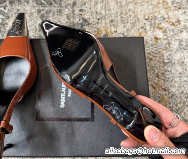 Pretty Style Saint Laurent Slingback Pumps 10.5cm in Shiny Leather Brown/Silver 1028103