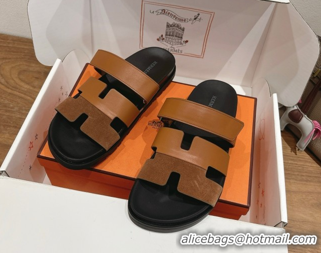 Best Quality Hermes Chypre Slide Sandals in Calfskin and Suede Dark/Brown H082008 0820070