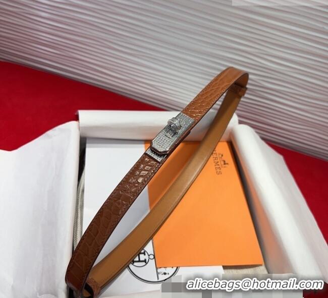 Best Quality Hermes Kelly Duo Belt 1.8cm in Crocodile Embossed Calfskin with Silver Strass Paved Buckle H2011025 Brown 2
