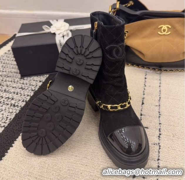 Unique Style Chanel Suede & Patent Leather Platform Ankle Boots with Chain and Buckle Black 2025 CH110412 1104059