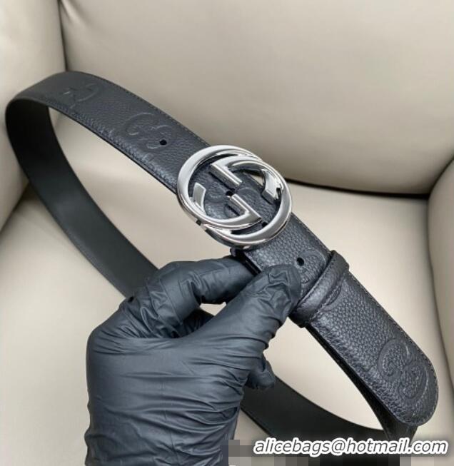 Top Grade Gucci Calfskin Leather Belt 4cm with Interlocking G Buckle 1127 Black/Gunmetal 2024
