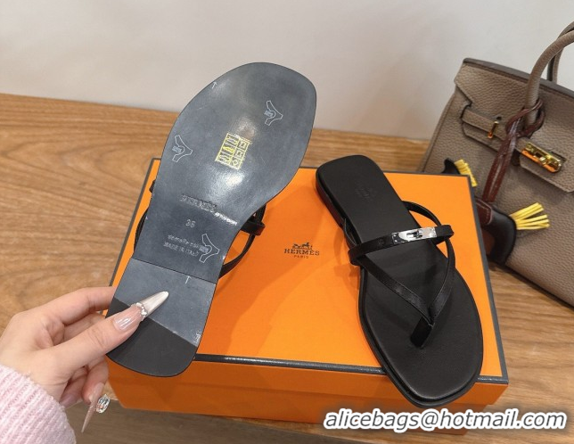 Discount Hermes Miss Flat Slides Thong Sandal in Calfskin Leather with Kelly Buckle Black 2026 0304020