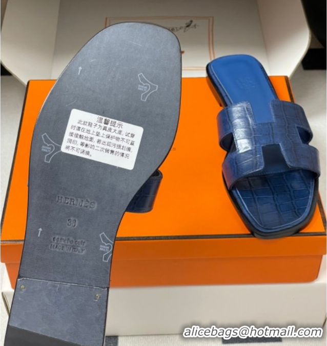 Good Quality Hermes Oran Classic Flat Slides Sandal in Crocodile Embossed Calfskin Dark Purple 2025 H081803