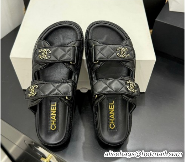 Low Price Chanel Lambskin Leather Strap Flat Slides Sandal with Chain CC CH030614 Black 2026