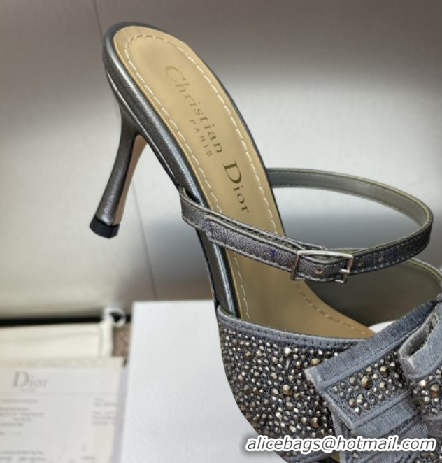 Grade Quality Dior Adiorable Heeled Strap Slides Sandal 7cm in Embroidered Cotton and Lambskin with Strass, Pearls and Bow Grey 0822032