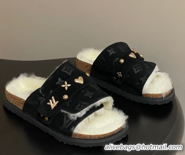 Best Price Louis Vuitton x Birkenstock Flat Slides Sandal with Charm Strap in Suede and Wool Black 1022121