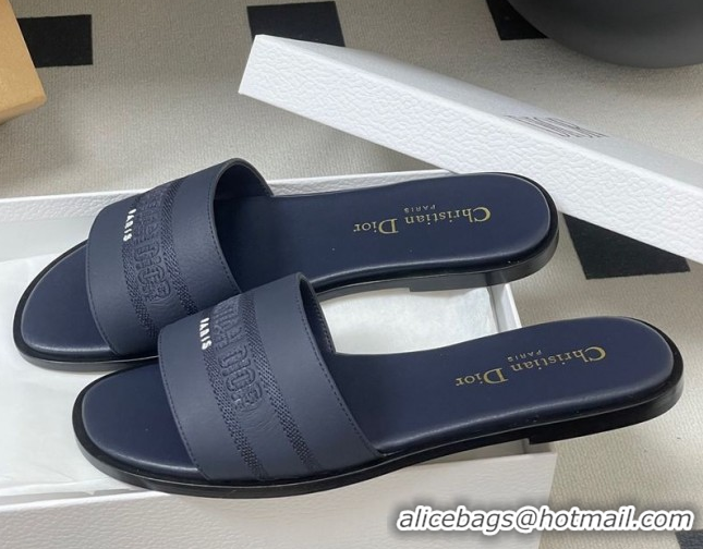 Low Price Dior Dway Flat Slides Sandal in Grained Calfskin Leather Deep Blue 50822066