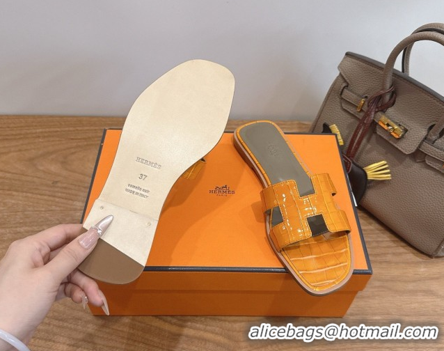 Charming Hermes Oran Classic Flat Slides Sandal in Crocodile Embossed Leather Orange Yellow 0304066