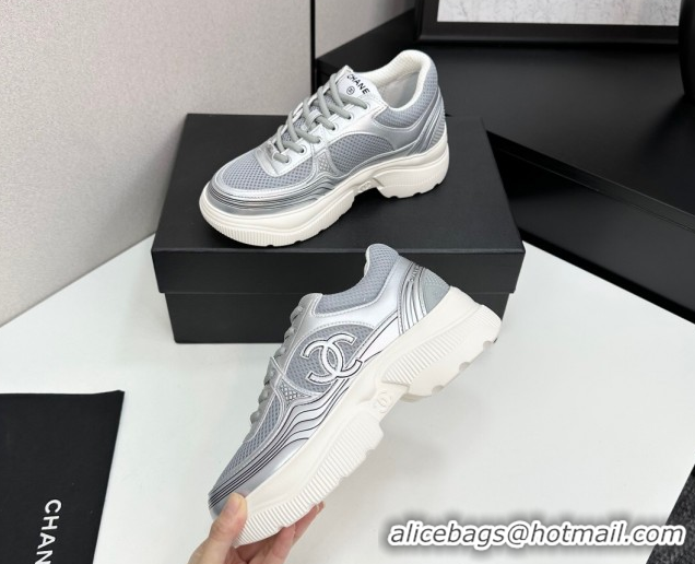 Pretty Style Chanel Calfskin Leather and Mesh Platform Sneakers Silver/Grey 2025 CH110104 1101043