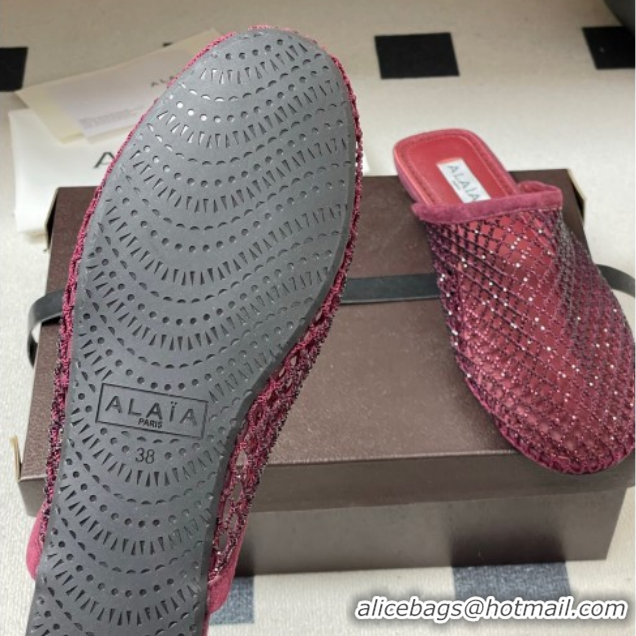 Classic Hot Alaia Flat Mules in Fishnet and Suede with Strass Burgundy AL020703