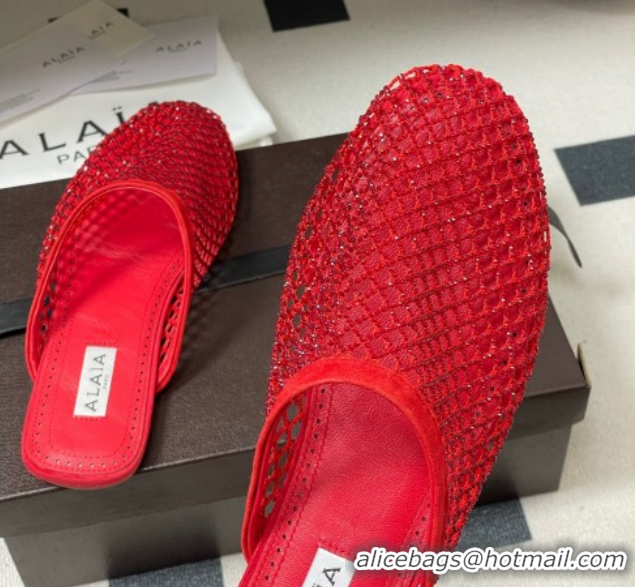 Good Looking Alaia Flat Mules in Fishnet and Suede with Strass Red 2026 AL020703