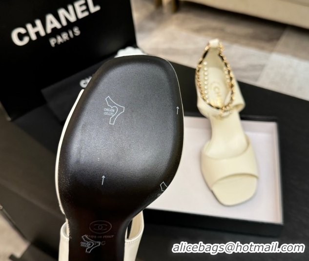 Classic Hot Chanel Lambskin Heel Sandals 8cm with Chain and Pearls White G46658
