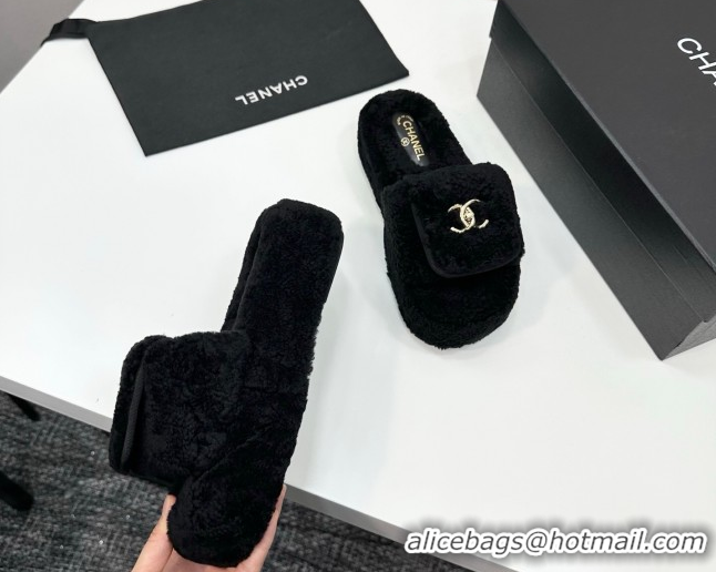 Purchase Chanel Shearling Wool Platform Slides Sandal with Foldover Black 2025 CH103106 1031132