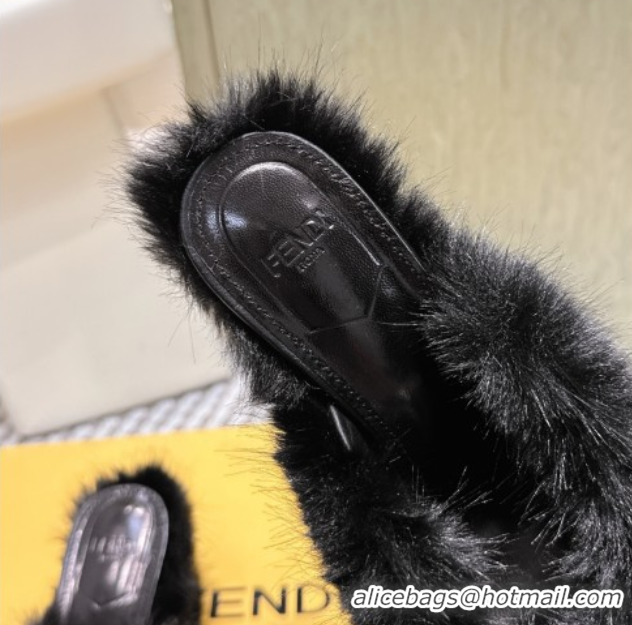 Classic Hot Fendi Arco Wedge Mules 7.5cm in Rabbit Fur Black 1030004