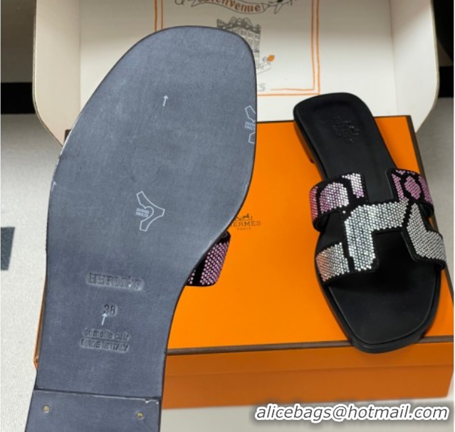 Sophisticated Hermes Classic Oran Flat Slides Sandal in Suede and Strass Black/Pink 1023106