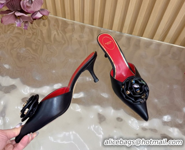 Pretty Style Valentino Calfskin Leather Heel Mules 5.5cm with Strass Stones and Rose Blossom Black 2025 VLTN121503 12150