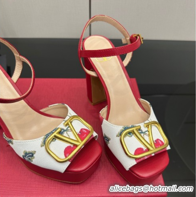 Classic Hot Valentino VLogo Signature Cherryfic Platform Sandals in Canvas and Leather White/Red 1028001