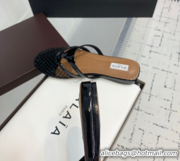 Design Alaia Intricated Flat Mules in Fishnet and Patent Calf Leather Black 0428067